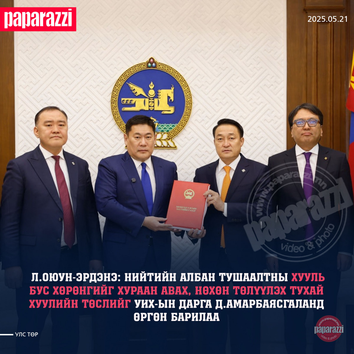 Монгол Улсын Их Хурлын дарга Д.Амарбаясгаланд өнөөдөр (2025.05.21) Монгол Улсын Ерөнхий сайд Л.Оюун-Эрдэнэ, Монгол Улсын Тэргүүн шадар сайд Л.Гантөмөр, Монгол Улсын Шадар сайд Т.Доржханд, Хууль зүй, дотоод хэргийн сайд О.Алтангэрэл нар Нийтийн албан тушаалтны хууль бус хөрөнгийг иргэний журмаар нэхэмжлэх, нөхөн төлүүлэх тухай хуулийн төсөл болон түүнийг дагалдуулан боловсруулсан бусад хуулийн төслийг өргөн барилаа.