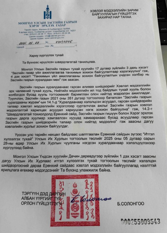 Сүүлийн өдрүүдэд үүсээд байгаа нөхцөл байдлын талаар хэвлэл мэдээллийн байгууллагууд Ерөнхий сайд Л.Оюун-Эрдэнийг нэгдсэн мэдээллийг өгөх хүсэлтийг хүргүүлээд байгаа. Түүнд ЗГХЭГ-аас хариу ирүүлжээ.