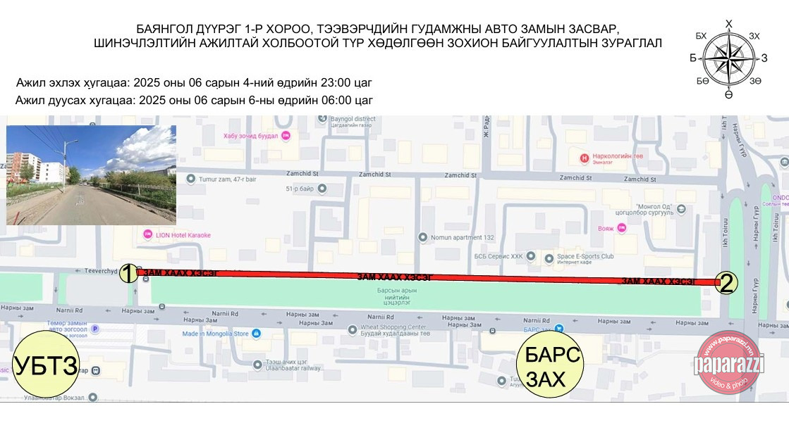 Нарны гүүрний баруун талын авто замаас УБТЗ-ын хойд автобусны буудал хүртэлх авто замыг хааж, шинэчилнэ