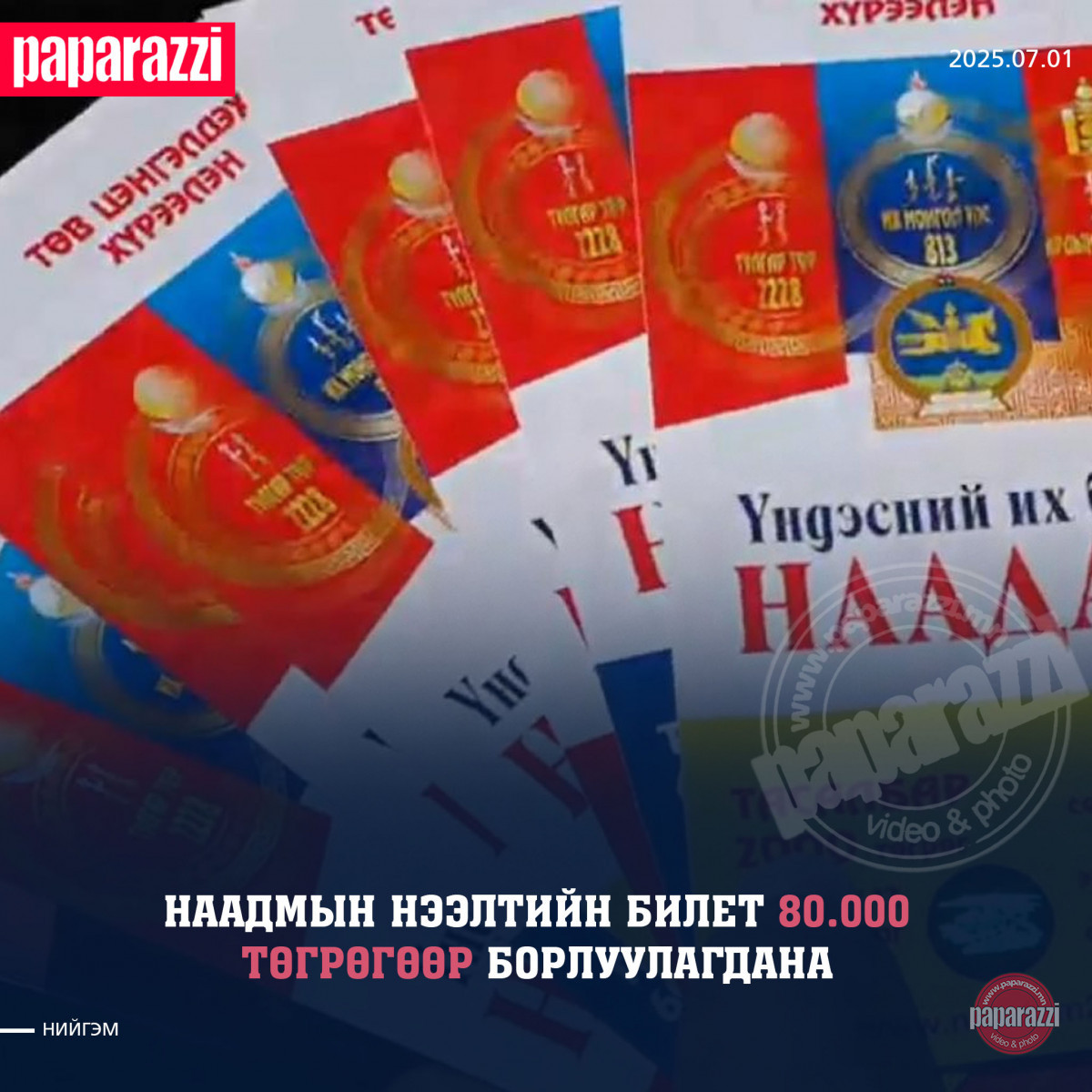 Баяр наадмын тасалбарыг маргааш өглөө 07.00 цагаас эхлэн enaadam.mn сайтаар борлуулж эхэлнэ. Нэг иргэн хоёр тасалбар авах боломжтой. Баяр наадмын нээлт, бөхийн барилдаан зэрэг Төв цэнгэлдэх хүрээлэнд болох арга хэмжээний 7-р сарын 11, 12-ны өдрийн тасалбарын үнэ 110 мянган төгрөг. Мөн ticket.mn-ээр баярын оройн тоглолтын тасалбарыг 80 мянган төгрөгөөр борлуулна, нэг хүн хэдэн ч тасалбар авах боломжтой.
