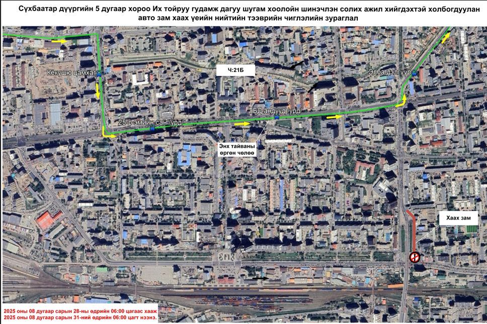 Сүхбаатар дүүргийн тавдугаар хорооны нутаг дэвсгэр Их тойруу гудамж дагуу шугам хоолойг шинэчлэн солих тул маргааш өглөө буюу наймдугаар сарын 28-ны 06:00 цагаас замыг хаахаар болсон байна.