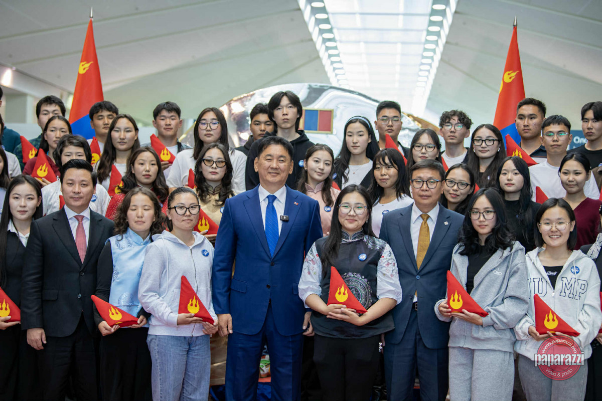 Монгол Улсын Ерөнхийлөгч Ухнаагийн Хүрэлсүх оюутан залуусыг үдэх ёслолд оролцож, сурлагын өндөр амжилт хүсэн Төрийн далбаа дурсгалаа.