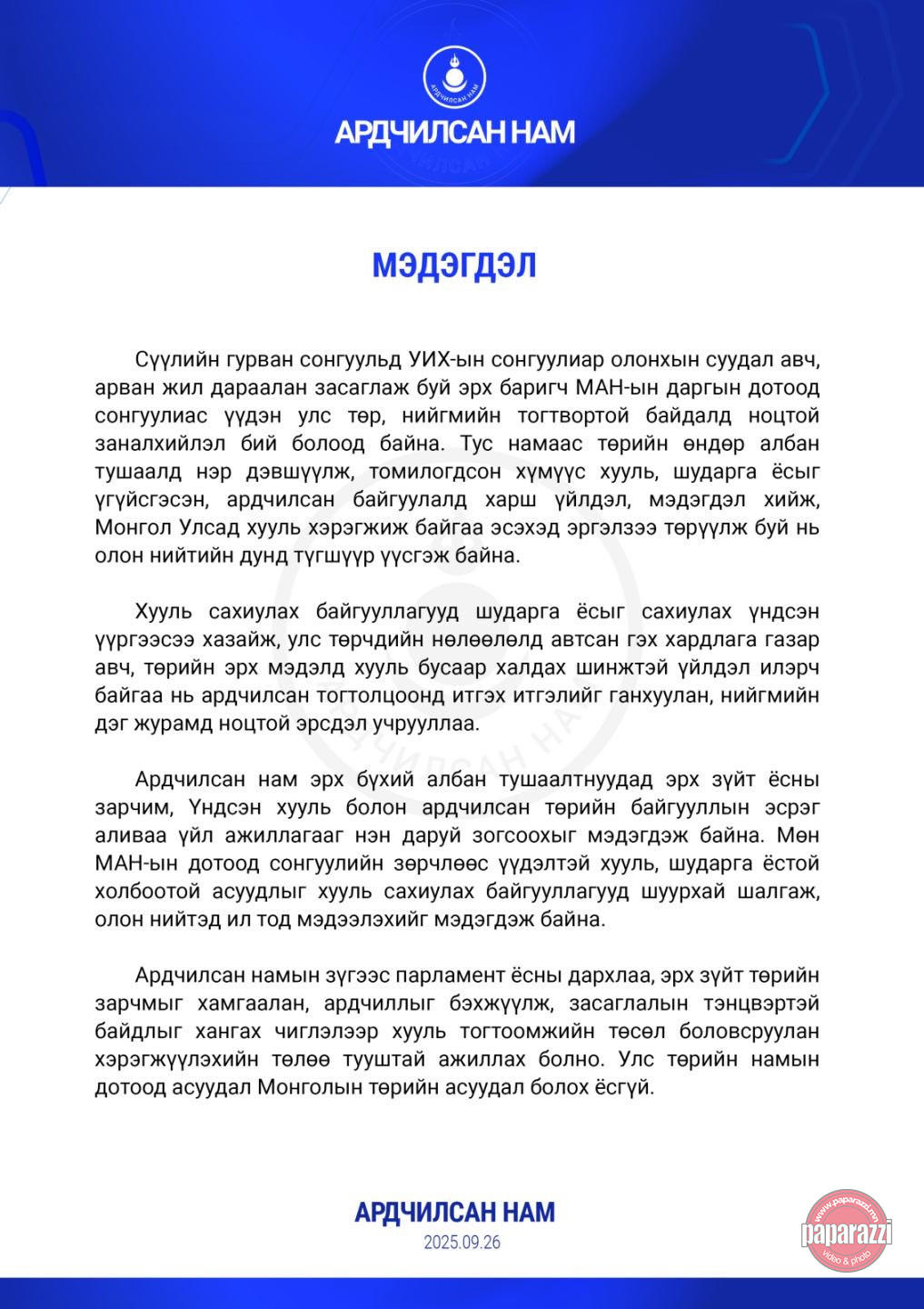 Сүүлийн гурван сонгуульд УИХ-ын сонгуулиар олонхын суудал авч, арван жил дараалан засаглаж буй эрх баригч МАН-ын даргын дотоод сонгуулиас үүдэн улс төр, нийгмийн тогтвортой байдалд ноцтой заналхийлэл бий болоод байна. Тус намаас төрийн өндөр албан тушаалд нэр дэвшүүлж, томилогдсон хүмүүс хууль, шударга ёсыг үгүйсгэсэн, ардчилсан байгуулалд харш үйлдэл, мэдэгдэл хийж, Монгол Улсад хууль хэрэгжиж байгаа эсэхэд эргэлзээ төрүүлж буй нь олон нийтийн дунд түгшүүр үүсгэж байна.