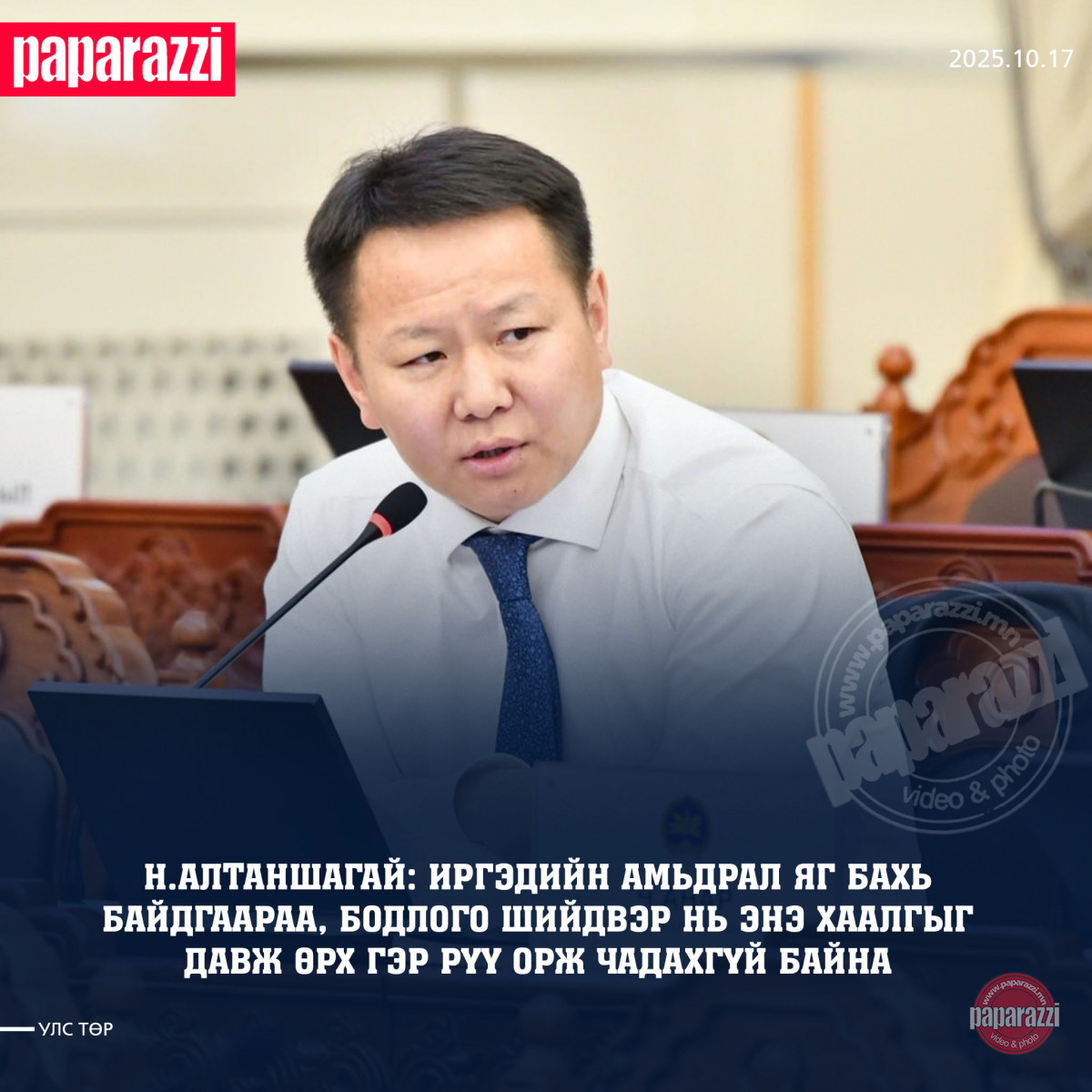 Багш нар нь эмч нар нь ажил хаячихсан, ахмадууд маань тэтгэврээ нэмүүлэхээр гудамд гараад суучихсан, ААН-үүд нь татварын реформ, хөнгөлөлтүүдийг хийж өгөөч гээд нүдээ ширгэтэл харж байна. Ийм байхад гишүүд чуулгандаа суухгүй инээд алдаад коридорт кофе бариад алхаж байна. Та нарт инээдэм байж болно. Ард, иргэдэд ханиадам байна.
