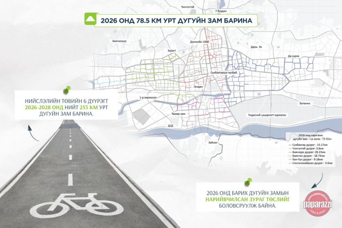 Нийслэлийн зургаан дүүрэгт 2026-2028 онд нийт 253 км урт дугуйн замын барилгын ажил хийхээр төлөвлөсөн. Үүнээс 2026 онд 78.5 км урт дугуйн зам барих нарийвчилсан зураг төслийг боловсруулж байна. Тодруулбал, Сүхбаатар дүүрэгт 15.17 км, Чингэлтэй дүүрэгт 3.6 км, Баянзүрх дүүрэгт 28.23 км, Баянгол дүүрэгт 18.74 км, Хан-Уул дүүрэгт 9.18 км, Сонгинохайрхан дүүрэгт 3.6 км дугуйн зам барих юм.