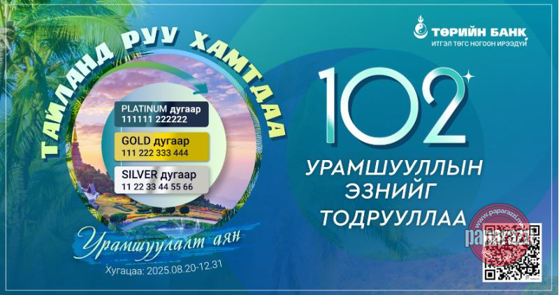 Төрийн банк Монгол Улсын өнцөг булан бүр дэх хоёр сая гаруй харилцагч иргэд болон аж ахуйн нэгжүүдийнхээ харилцах, хугацаагүй хадгаламжийн дансыг идэвхжүүлэх зорилгоор 396 азтантай “Тайланд руу хамтдаа” урамшуулалт аяныг наймдугаар сарын 20-ноос 12 дугаар сарын 31-ний өдрийг дуустал дөрвөн үе шаттай зохион байгуулж байгаа билээ.