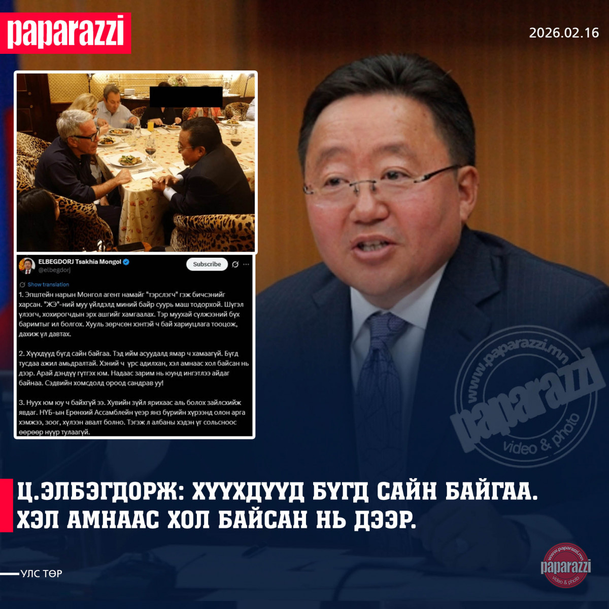 Мөн Ерөнхийлөгч асан Ц.Элбэгдорж Жеффри Эпштейнтэй уулзаж буй зураг ч цахим орчинд цацагдсан. Энэ талаар Ц.Элбэгдорж тайлбарлахдаа: