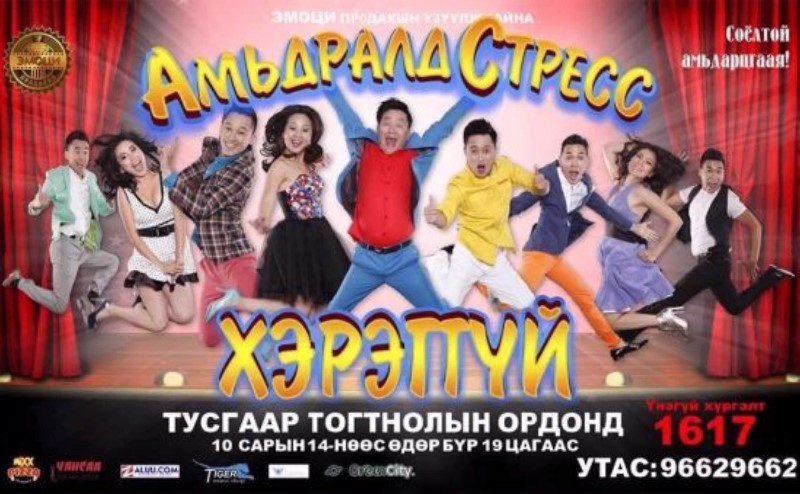 Монголын Хошин Урлагийн хамгийн залуу "Эмоци" продакшны "Амьдралд стресс хэрэггүй" цоо шинэ инээдмийн шоу тоглолтыг үзэгч та бүхэндээ хүргэхэд бэлэн боллоо. 10 сарын 14-өөс Тусгаар Тогтнолын ордонд өдөр бүр 19:00 цагаас үзэгчидтэйгээ уулзах энэхүү тоглолт хамгийн хамгийн гэсэн тодотголуудыг араасаа дагуулах биз ээ. Чадварлаг, залуу хамт олноор хүчээ сэлбэсэн болоод ч тэрүү тус хамтлагийнханы урьд урьдын тоглолтууд тун амжилттай тоглогдсон. Ийнхүү ганц амьдрах амьдралдаа стрессээс хол байж, инээдээр өөрсдийгөө цэнэглэцгээе.