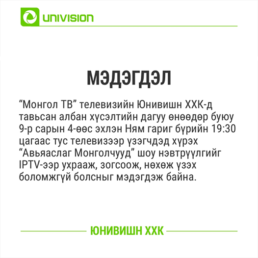 Монголдоо дэлхий жишигт нийцэхүйц шоуг зохион байгуулж, үзэгчдийг зурагтынх нь өмнө хэдэн цагаар уяж, дууссан цагаасаа дахиж хэзээ эхлэх вэ гэсэн хүлээлтийг үүсгэсэн шоу бол  "Авъяаслаг Монголчууд" шоу нэвтрүүлэг билээ. Тэгвэл үзэгчдийн хүсэн хүлээсэн шоу өнөөдөр буюу /2016.09.04/ орой 19 цагт гарч эхлэх бөгөөд  үүнтэй зэрэгцэн нэгэн тааламжгүй мэдэгдэл гарлаа. Тус нэвтрүүлгийг бид өмнө нь цагт нь үзээгүй ч ухрааж үзэх бүрэн боломжтой байсан бол  энэ удаад  Монгол HD, "Univision" компани хамтран мэдэгдэл хийснээр ухрааж, зогсож, нөхөж үзэх боломжгүй болж байгаа юм байна.