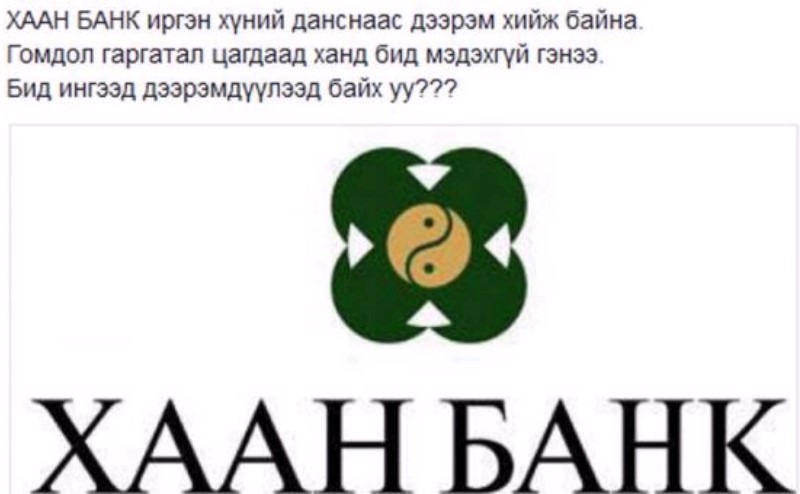 Тухайлбал, өчигдөр “Хаан банк”-ны харилцагч Д.Анхбаяр гэх хүний данснаас хоёр сая төгрөг ор, мөргүй алга болсон байна. Түүний дансанд өчигдөр 15:49 минутад хоёр сая төгрөгийн орлого орсон ч 40 минутын дараа зарлага хэлбэрээр гарчээ. Хоёр сая төгрөгийн зарлага хаашаа, яаж гарсан шилжсэн талаар буюу данснаас нь мөнгө гэнэт алга болсон асуудлаар харилцагч Д.Анхбаяр Хаан банкинд өөрийн биеэр хандан асуухад “Хэн рүү, ямар утгатай гүйлгээ хэдэн цагт хийгдсэн нь мэдэгдэхгүй байна. Бид шийдэж мэдэхгүй учир цагдаад ханд” гэх хариуг өгчээ. Эзэн нь олдохгүй энэ хэргийн асуудлаар Д.Анхбаяр хууль хяналтын байгууллагад хандаад байгаа аж.