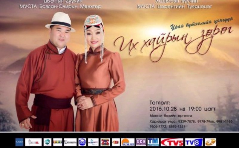 “Их хайр”, “Хослох зүрхний уянга”, “Хайрын наран” гээд олон сайхан дууг ард түмнийхээ зүрх сэтгэлд хосоороо эгшиглүүлж буй ДБЭТ-ын дуучин СТА Б.Мөнхтөр, ХЦДБЧ-ын дуучин СТА Ц.Туяацэцэг нарын хамтарсан уран бүтээлийн цэнгүүн “Их хайрын зөрөг” нэртэйгээр түмний хүртээл болох гэж байна. Энэ сарын 28-ны 19 цагаас Монгол бөхийн өргөөнөө болох тоглолтод Б.Туяацэцэгийн эгч УГЖ Ц.Чулуунцэцэг, Ц.Отгонцэцэг нар оролцон ая дуугаа өргөхөөс гадна СТА Л.Банзрагч, Б.Гомбо-Очир, Н.Төмөрсүх, дуучин Н.Бизъяа нарын уран бүтээлчид ч ая дууны дээжээ өргөх аж.