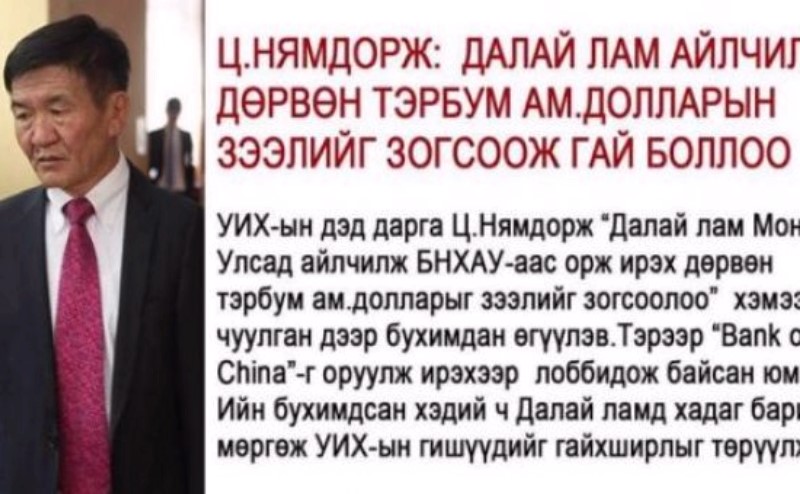 УИХ-н дэд дарга Ц.Нямдорж энэ удаад ч бас дуугүй өнгөрсөнгүй бололтой. Ер нь л түүнд таалагдах зүйл тун ховор байдаг хойно доо. Тэрбээр “Далай лам манай улсад айлчилснаар БНХАУ-аас орж ирэх дөрвөн тэрбум ам долларын зээлийг зогсоолоо” хэмээн бухимдангуй байсан ч Далай ламд хадаг барин мөргөж олны гайхшралыг төрүүлжээ.