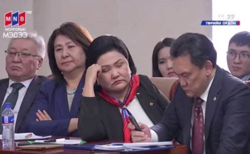 Ерөнхийлөгч Ц.Элбэгдорж өнөөдөр Төрийн ордонд сэтгүүлчидтэй "Зангиагүй" уулзалт хийсэн юм. Тус уулзалтын үеэр тулгамдаад буй утааны асуудлыг хэлэлцлээ. Улаанбаатарын утаа гамшгийн хэмжээнд хүрч, нийслэл хотын 1,3 сая хүний эрүүл мэндэд онц ноцтой хохирол учирч мэдэхээр байгаа билээ. Энэ үед Ц.Элбэгдорж юу гэж хэлэх нь олон хүний анхаарлын төвд байгаа. Гэтэл тус уулзалтын үеэр (БОНХАЖ)-ын сайд Д.Оюунхорол хээв нэг тухлан, унтаж байх жишээтэй. Чухал асуудлыг хэлэлцэж байхад төрийн сайд хүн үл тоосон янзтай, хэвтэж байх нь зөв үү.