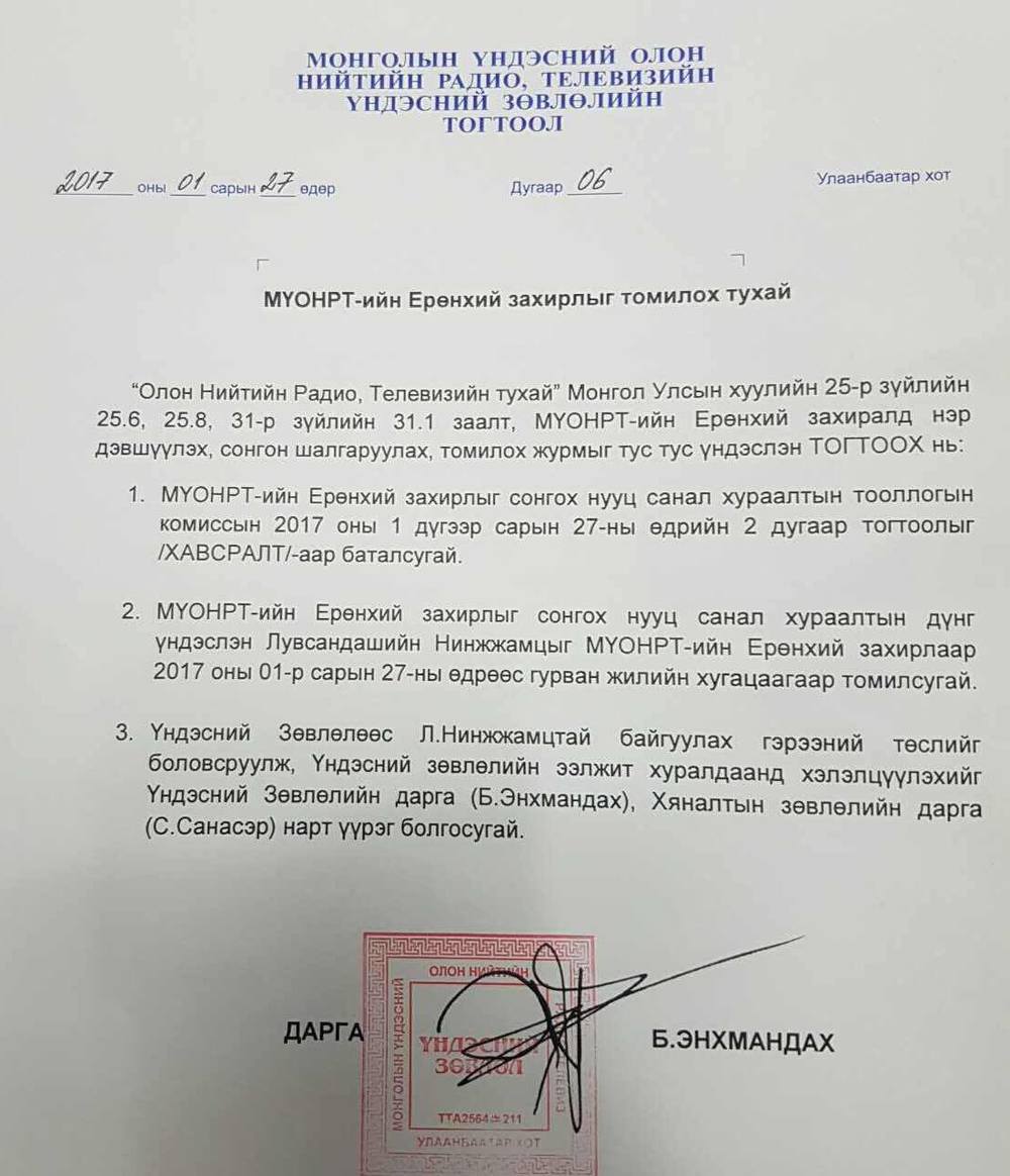 МҮОНРТ-ийн Ерөнхий захирлыг шалгаруулах сонгон шалгаруулалтыг олон нийтийн дунд нээлттэй зарлан явуулж шалгаруулалтад есөн нэр дэвшигч өрсөлдсөнөөс Лувсандашийн Нинжжамц олонх саналыг авч Ерөнхий захирлаар томилогджээ.
