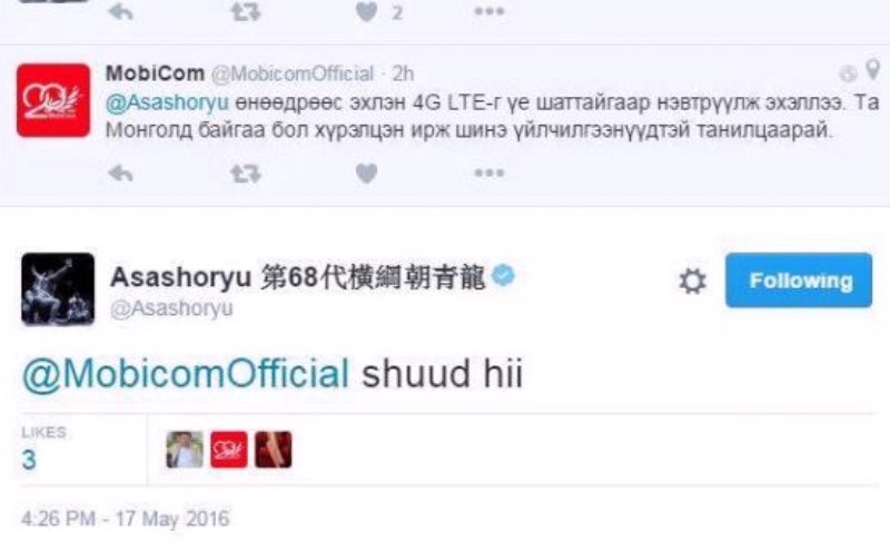 Их аварга Асашёорюү Д.Дагвадорж Мобикомын хэрэглэгч бөгөөд өөрийнхөө утсыг 4G сүлжээнд холбомоор байгаагаа ийн илэрхийлжээ. Одоо үед хүн бүхэн л ухаалаг утаснаасаа хурдтай интернетд холбогдохыг хүсдэг болсон. Мобиком корпораци ч Их аваргийн энэ хүсэлтэд хэрэглэгчээ хүндлэн ямар хариулт өгсөнийг хамтдаа харцгаая.