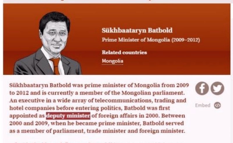 Тус материалд "Сүхбаатарын Батболд 2009-2012 оноос Монгол Улсын Ерөнхий сайд байсан. Одоо УИХ-ын гишүүн юм. Улс төрд орохын өмнө харилцаа холбоо, худалдаа, зочид буудал гэсэн өргөн хүрээг хамарсан компаний гүйцэтгэх захирал байсан. 2000 онд Батболд Гадаад хэргийн дэд сайдаар томилогдсон.