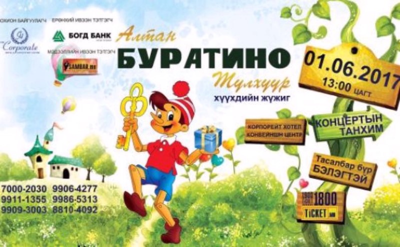 Олон улсын хүүхдийн эрхийг хамгаалах өдрийг тохиолдуулан Корпорейт Конвеншн Центр- КОНЦЕРТЫН ТАНХИМД 2017.06.01-ний өдрийн 13:00 цагт БУРАТИНО- АЛТАН ТҮЛХҮҮР” хүүхдийн жүжгийг тоглох гэж байна. Та хүүхдээ хэрхэн баярлуулахаа мэдэхгүй, хөл үймээнд яаж явах вэ хэмээн эмээж байгаа бол The Corporate Hotel & Convention Centre зохиож байгаа уг тоглолтыг зориорой.