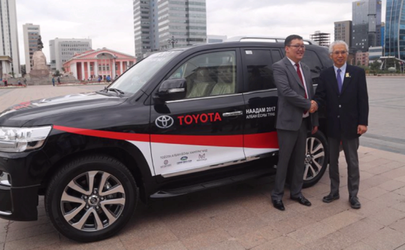 Үндэсний их баяр наадмын зохион байгуулах ажлын хэсгийн дарга М.Эрдэнэжаргал, Тоёота мотор корпорацийн Төлөөлөгчийн газрын захирал Цүёши Аваи нар Үндэсний их баяр наадмын бөхийн шагналын талаар өнөөдөр сэтгүүлчдэд мэдээлэл өгсөн байна. Үндэсний их баяр наадмын албан ёсны түншээр Японы Тоёота компани дөрөв дэхь жилдээ ажиллаж байна. Үндэсний бөхийн барилдаанд түрүүлсэн бөхийг “Ланд крузер-200” маркийн автомашинаар шагнадаг уламжлал тогтоод байгаа юм. Тоёота Мотор Корпорацийн Төлөөлөгчийн газрын захирал Цүёши Аваи “Юуны өмнө үндэсний их баяр наадмаа тэмдэглэх гэж буй та бүхэнд баяр хүргэе. Тоёота мотор корпораци нь улсын баяр наадмыг дэмжиж, түнш болж дөрөв дэхь жилээ угтаж байна. Биднийг дэмжин ажилладаг та бүхэнд баярлалаа” хэмээн хэллээ. Үндэсний бөхийн барилдаанд түрүүлсэн бөхийн бай шагналыг 7-р сарын 13-ны өдөр 12:00 цагт Жанжин Д.Сүхбаатарын талбайд гардуулна. Энэ үеэр наадмын албан ёсны түнш “Тоёота” компани шинэ загваруудаа танилцуулахаас гадна Замын хөдөлгөөний аюулгүй байдал, байгаль орчинд ээлтэй жолоодлоготой холбоотой үйл ажиллагааг таниулж, сурталчлах ажлуудыг хийхээр төлөвлөсөн байна.