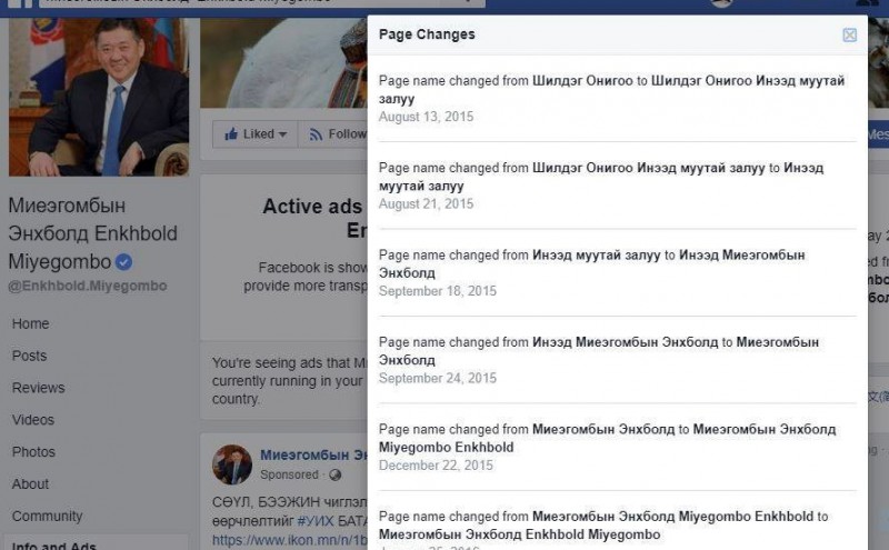 “Info and Ads” хэсэгт нэвтэрснээр фэйсбүүк дахь бүх хэрэглэгч тухайн пэйж хуудсанд "sponsor" хийсэн зар сурталчилгааг нээлттэй харахаас гадна пэйжүүд нэрээ хэдэн удаа, яаж өөрчилж байсныг харах боломжтой боллоо. Пэйж хуудсанд ямар мэдээг "sponsor" хийснийг харах боломжтой ч хэдэн төгрөгөөр хийж буй нь харагдахгүй.
