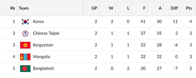Тэд өнөөдөр 17:20 цагт Кыргызстаны багтай хийх бол БНСУ-ын багтай 18:50 цагт тоглоно. Эхний хоёр тоглолтоо 23-нд хийсэн бөгөөд эхний тоглолтоо Тайваны багтай хийж 15-19 харьцаагаар хожигджээ. Харин хоёр дахь тоглолтоо Бангладешийн багтай хийсэн бөгөөд 17-13 харьцаагаар хожиж эхний хожлоо байгуулсан билээ.