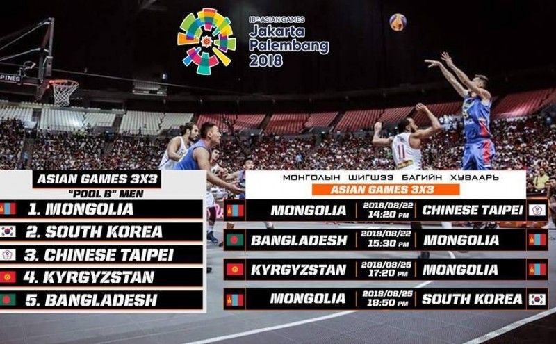 XVIII Азийн зуны спортын наадам энэ оны 08 дугаар сарын 18-наас 09 дүгээр сарын 02-ны өдрүүдэд Индонез улсын Жакарта, Палэмбанг хотуудад зохион байгуулагдаж байгаа билээ. Тэгвэл сагсан бөмбөгийн 3х3 төрлийн Монгол улсын эрэгтэй шигшээ баг маань В хэсэгт багтсан бөгөөд Тайван, Бангладеш, Киргизстан, Өмнөд Солонгос багуудтай нэг хэсэгт орсон билээ.