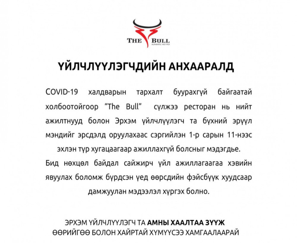 зөв шүү эрсдэл дагуулж болзошгүй байгууллагууд нийгмийн хариуцлагаа ухамсарлаж байгаа сайн жишээ THE BULL рестораны удирдлагууддаа баярлалаа