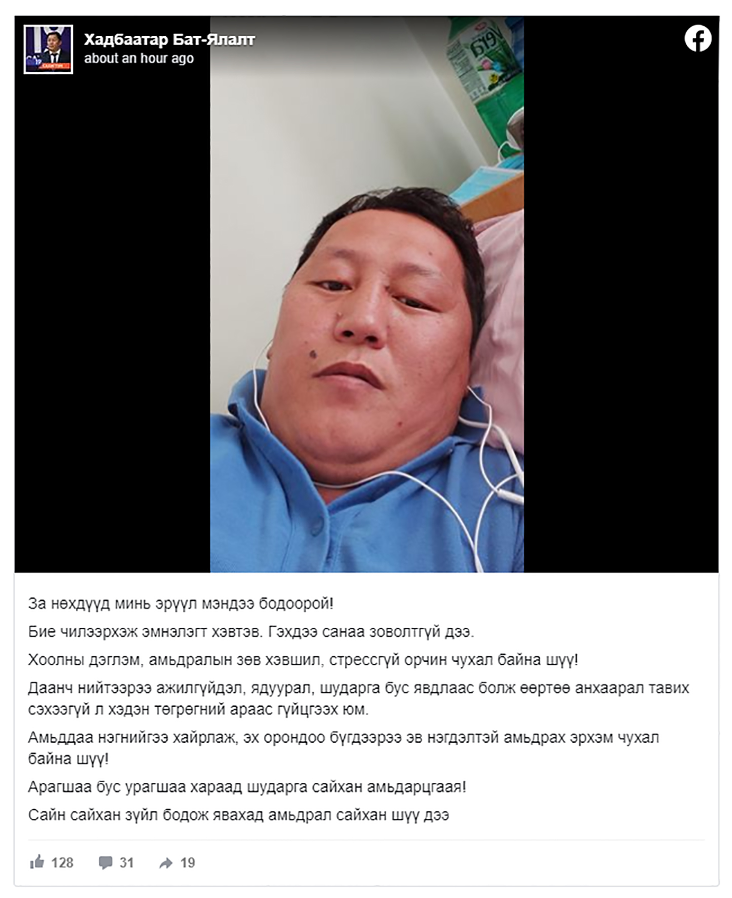 “Иргэдийн шударга шүүх” төрийн бус байгууллагын тэргүүн Х.Бат-Ялалтын бие муулан, эмнэлэгт хэвтсэн талаараа цахим хуудсаараа дамжуулан хэлэв.