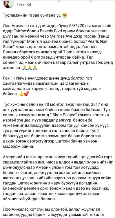 Харамсалтай нь Америкт ажиллаж амьдардаг монгол эмэгтэйн "Pearl Nail" нэртэй хумсны салон шатжээ. 12 цагийн турш шатсан барилга юу ч үгүй болсон байна. Энэ талаар нэгэн эмэгтэй цахим хуудсандаа бичжээ.